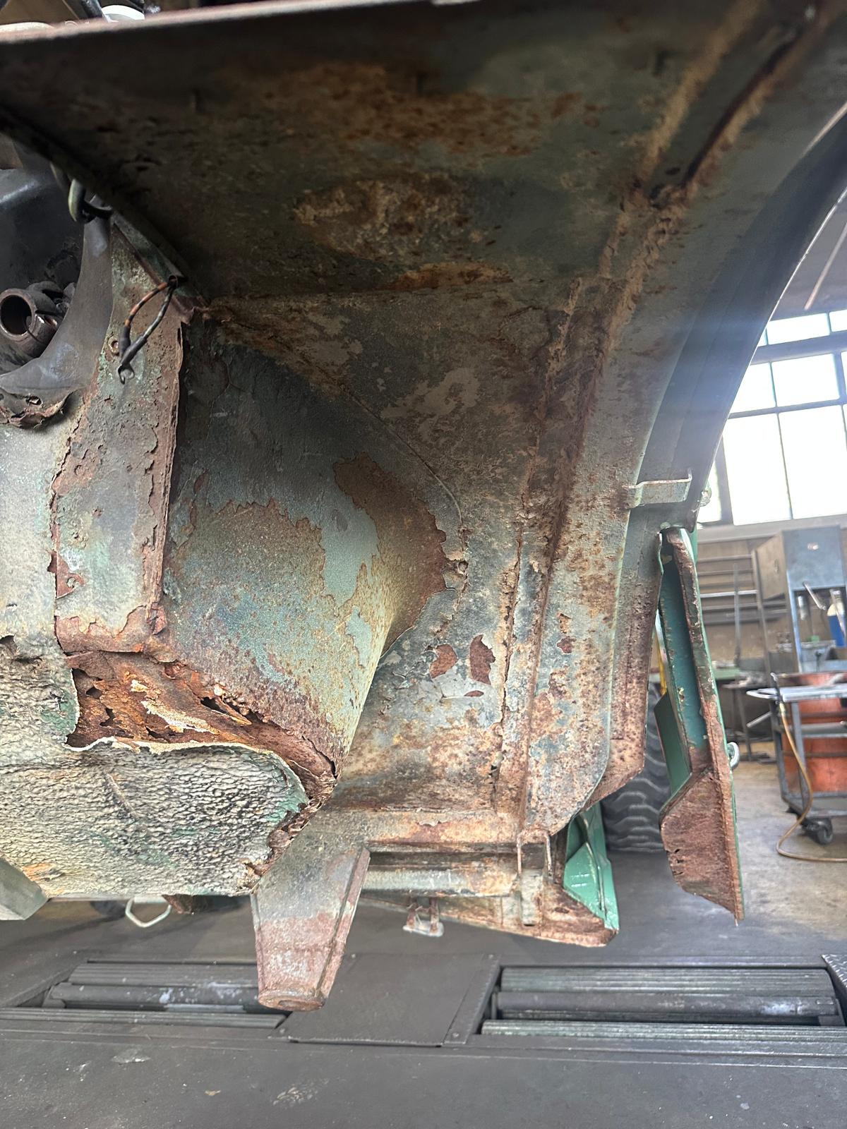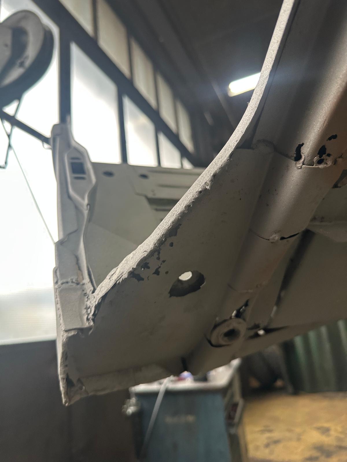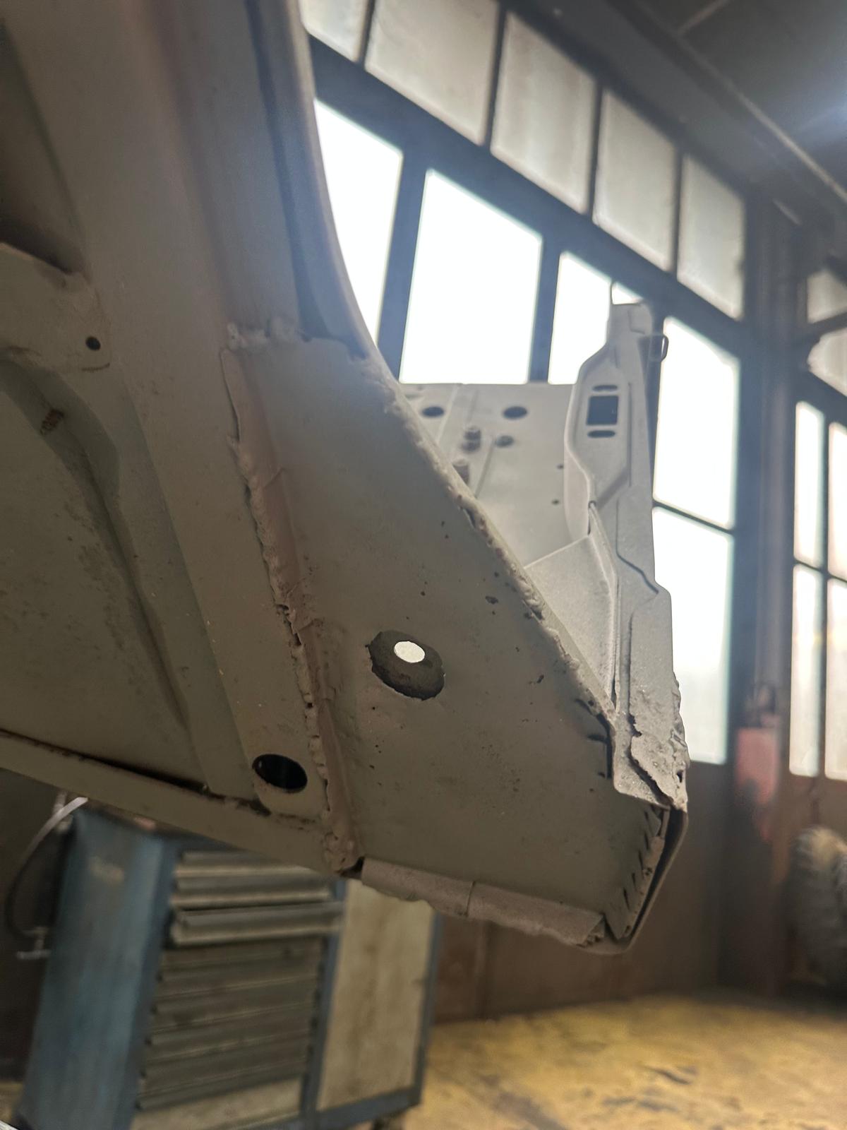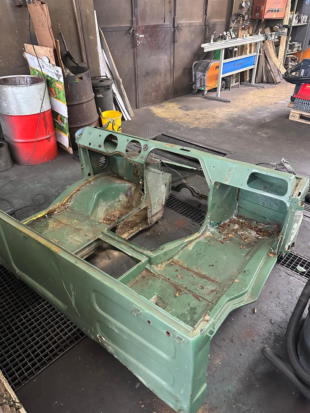 Update 3: Karosserie wurde sandgestrahlt, Thomas schweißt neue Bleche ein.