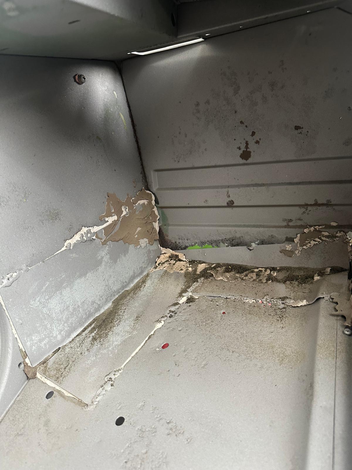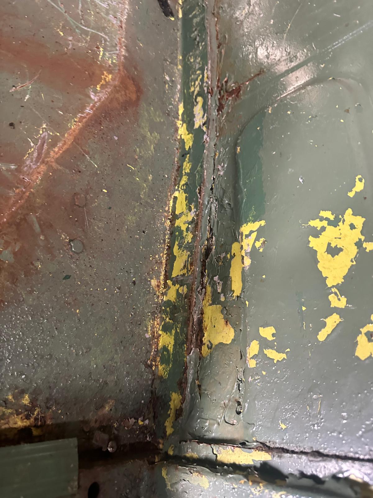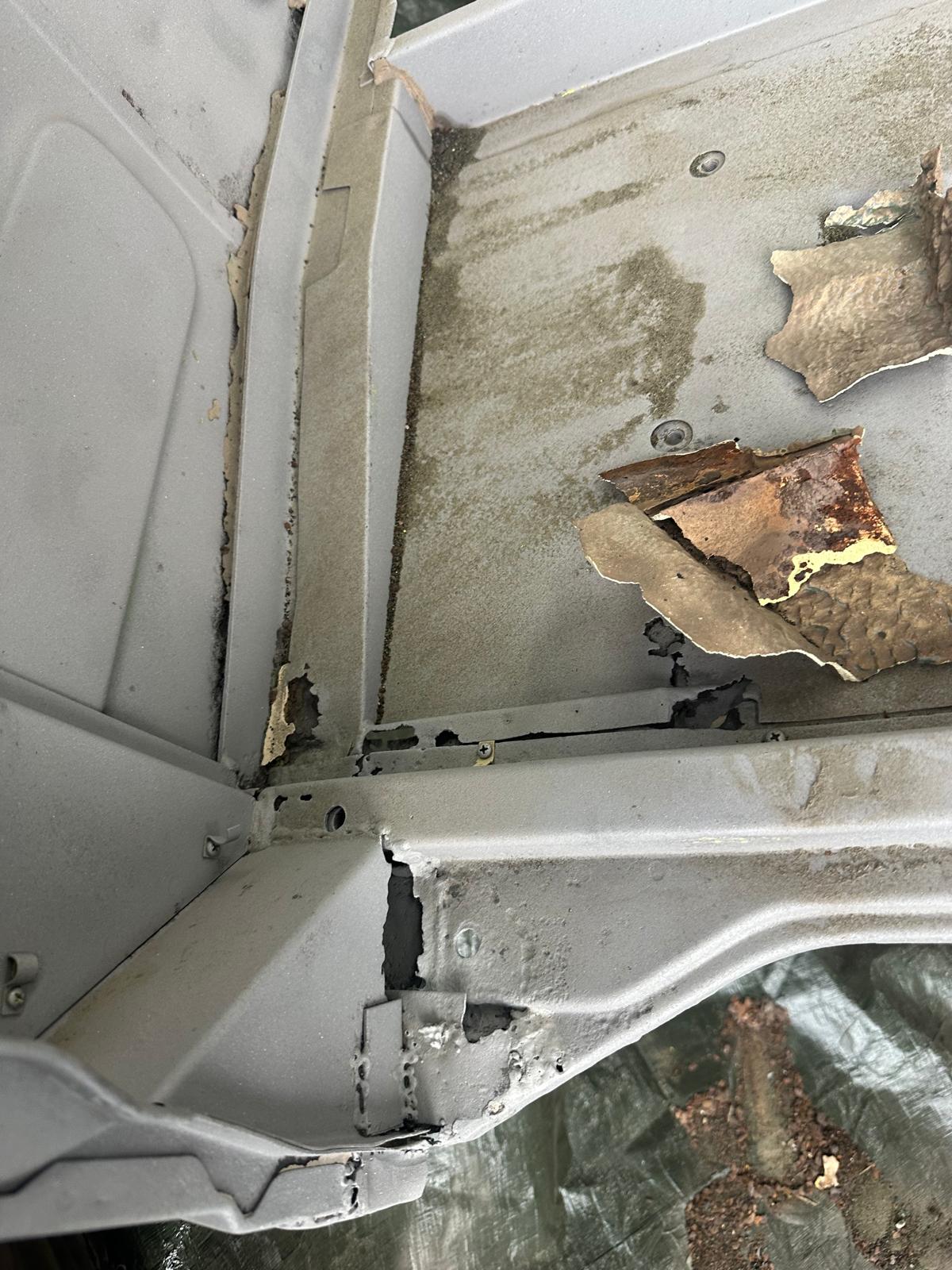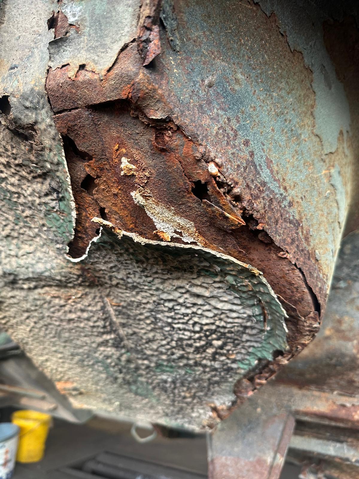 Update 3: Karosserie wurde sandgestrahlt, Thomas schweißt neue Bleche ein.